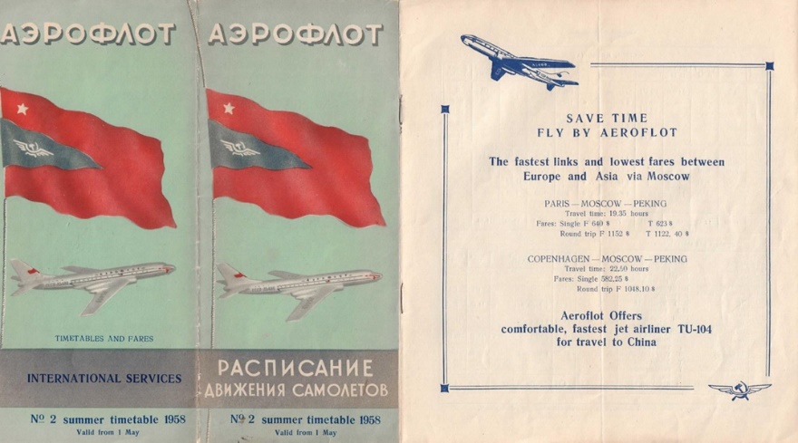 Sul chiudersi degli anni cinquanta apparvero le prime timide aperture anche se esse riguardavano non Tokyo ma Pechino. L’Aeroflot volava a Copenhagen, Helsinky, Parigi e da questi punti dell’Europa Occidentale la compagnia sovietica iniziò a offrire possibilità per volare in Cina in tempi ovviamente più rapidi di quanto facessero le compagnie occidentali. (2) Oltre alla sua rotta geograficamente più diretta la compagnia aveva messo in linea il quadrigetto Tupolev 104. (vedi locandina che segue)