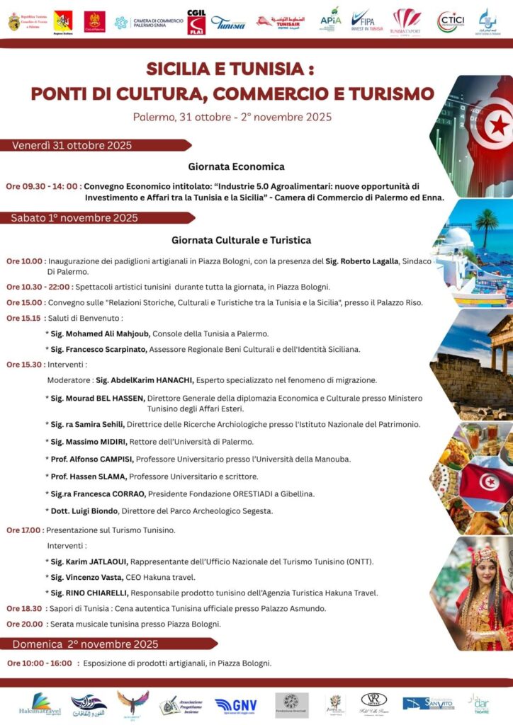 l’Ente Nazionale del Turismo Tunisino (ONTT), in collaborazione con il Consolato di Tunisia a Palermo e il Tour Operator Hakuna Travel, organizza a Palermo dal 31 ottobre al 2 novembre 2025 l’evento “Sicilia e Tunisia: Ponti di Cultura, Commercio e Turismo”, per rafforzare e promuovere la Tunisia in Sicilia,