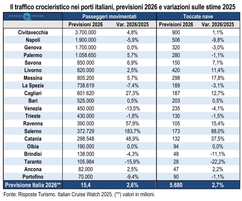 I risultati attesi per il 2026, contenuti nella nuova edizione dell’Italian Cruise Watch di Risposte Turismo, sono frutto della proiezione effettuata sulle previsioni di oltre 50 porti, rappresentativi del 91% sia del traffico crocieristico nazionale sia delle toccate nave e, secondo la consolidata metodologia utilizzata dai ricercatori di Risposte Turismo, tiene conto di numerosi fattori capaci di incidere sulle stime di traffico nel medio periodo, tra i quali i possibili cambi di itinerari delle navi durante la stagione e l’occupazione media attesa delle navi.