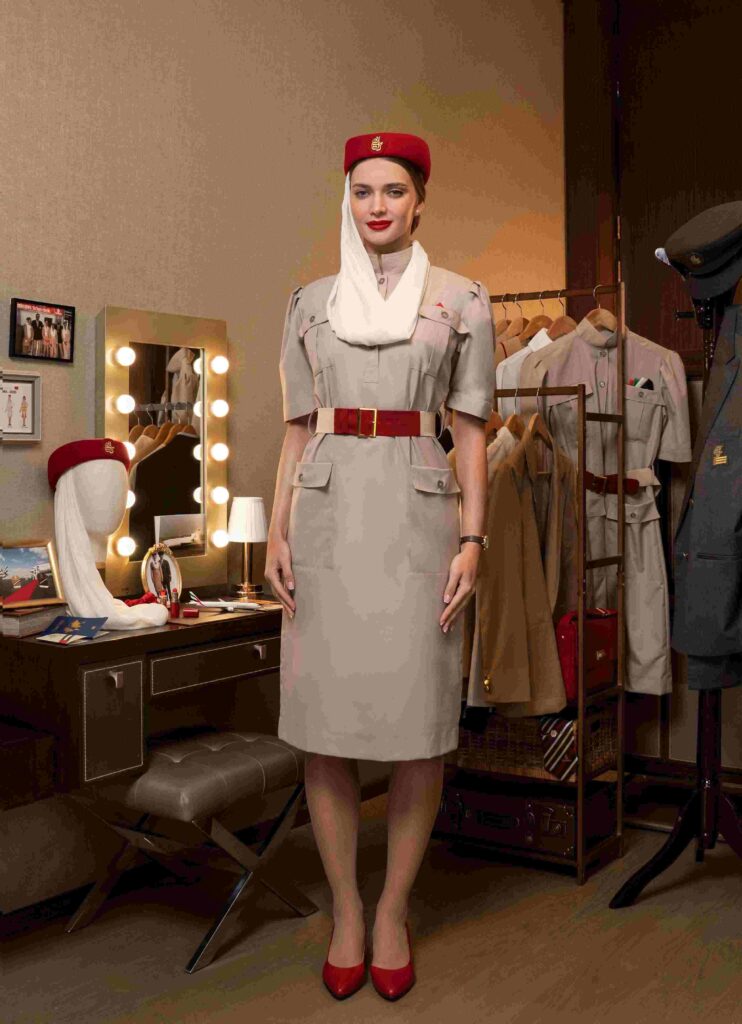 Il logo in grafia araba elaborata e la sciarpa di chiffon color crema, elegantemente drappeggiata, riflettono la cultura locale, con sette pieghe a rappresentare i sette Emirati degli Emirati Arabi Uniti. Il personale di cabina e i piloti di Emirates, uomini e donne, indossavano scarpe in pelle nera e un classico abito grigio con cravatta rossa, camicia bianca e insegne dorate. Nel 1987 un nuovo look: giacca beige a doppio petto con bottoni dorati, gonna lunga con una piega allungata, camicetta bianca con un sottile motivo a logo Emirates e il caratteristico cappello rosso con velo.