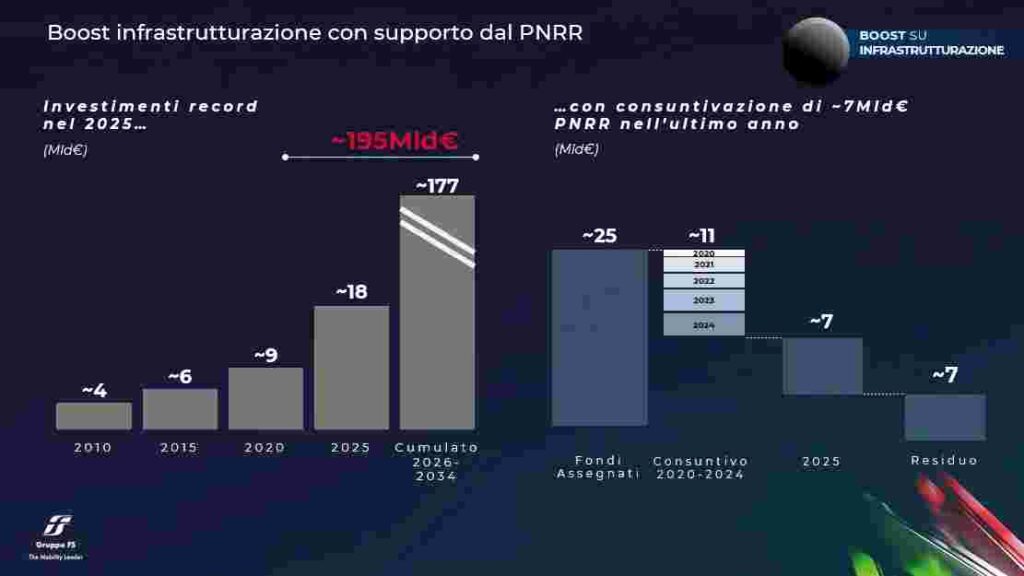 Il Gruppo FS ha avviato un percorso di aggiornamento del Piano Strategico puntando su quattro leve decisive per rafforzare competitività e capacità di investimento. Tra queste spicca il modello regolatorio RAB, considerato essenziale per garantire stabilità agli investimenti infrastrutturali: dopo la spinta del PNRR, che ha portato la spesa annua da 4 a 10 miliardi, l’obiettivo è consolidare una capacità di 12 miliardi l’anno, con un impatto stimato di 18 miliardi sul PIL e 120mila occupati.