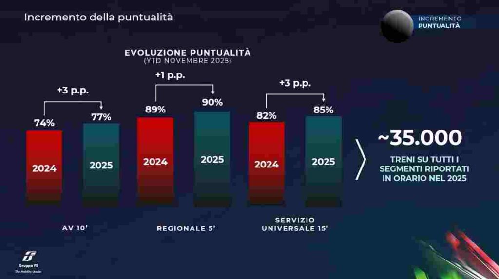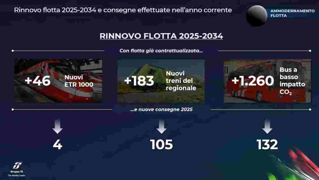 Il rinnovamento della flotta ha visto la consegna di 241 nuovi mezzi a basso impatto ambientale, tra treni e autobus, inclusa la nuova generazione del Frecciarossa 1000. Parallelamente, oltre 35mila treni sono stati riportati in orario, con un incremento di tre punti percentuali nella puntualità dell’Alta Velocità. Risultati concreti anche sul fronte della sicurezza, con una riduzione del 35% degli infortuni gravi, e della sostenibilità, grazie alla nascita di FS Energy, dedicata alla decarbonizzazione dei consumi.