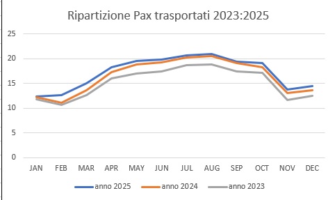 E analizzando gli ultimi tre anni si può osservare come il trend delle vendite, o della ripartizione passeggeri trasportati, segua un pattern ben collaudato che mostra sempre luglio e agosto come i mesi di picco vendite: