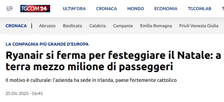 Accompagnate da informazioni del tipo: “ in questo modo Ryanair fa a meno di oltre 500mila passeggeri e circa 40 milioni di ricavi stimati per il 25 dicembre. “