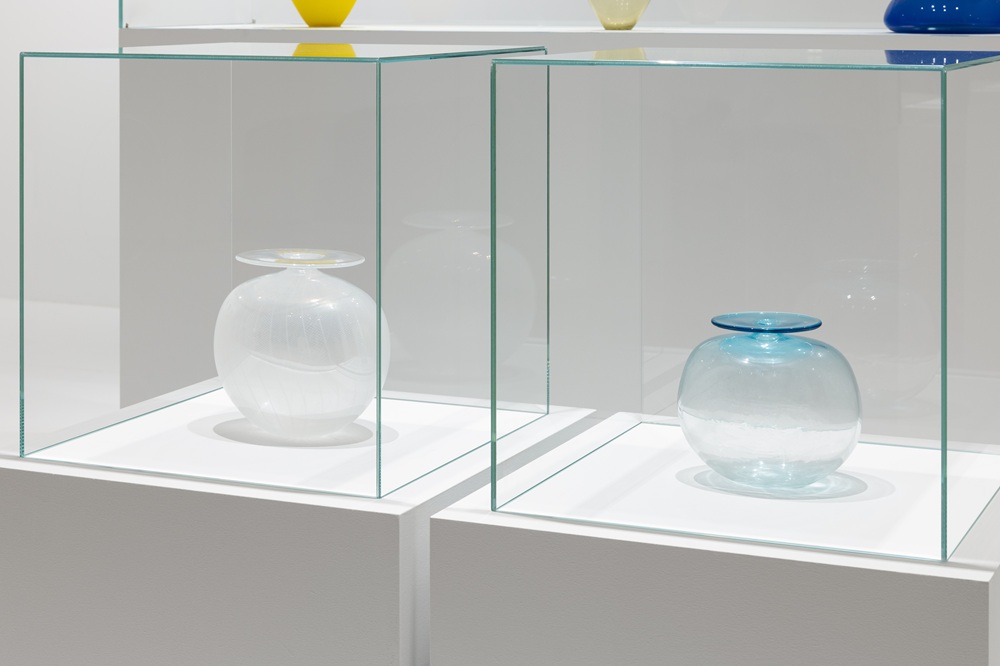 Gli oggetti in mostra sono realizzati in vetro soffiato e testimoniano concetti differenti della pratica dell’artista tra cui l’asimmetria, lo spazialismo, l’orientamento verso l’industrial design e l’unione delle tecniche produttive artigianali alla logica progettuale.