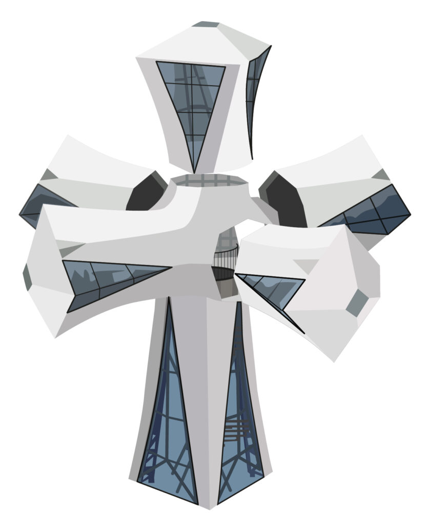 La costruzione della torre è il risultato di una sapiente combinazione tra innovazione tecnologica e tradizione artigianale. I pannelli che compongono la struttura sono realizzati in pietra precompressa, un sistema che integra pietra e acciaio e che ha permesso la prefabbricazione degli elementi fuori dal cantiere, riducendo tempi e complessità operative. Iniziata nel 2018 a quota 85 metri, l’elevazione ha raggiunto i 142,5 metri nel dicembre 2024, prima di procedere alla realizzazione del terminale e della croce. Quest’ultima, alta 17 metri e larga 13,5, è rivestita in vetro e ceramica bianca smaltata, materiali scelti per riflettere la luce e amplificare il significato simbolico dell’opera.