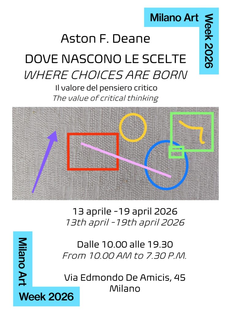 Aston F. Deane sarà presente alla Milano Art Week, dal 13 al 19 aprile, con la mostra Dove nascono le scelte. L’iniziativa si inserisce nel programma diffuso della settimana milanese dedicata all’arte contemporanea, proponendo un dialogo tra pratica artistica e consulenza di governo societario.
